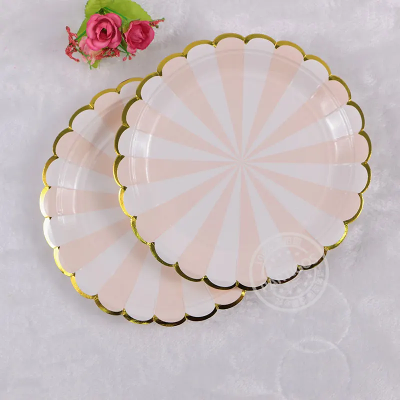SPECIAL OFFERS Gilding High end Disposable Tableware Set Pink green Striped Paper Plates Cups Napkins Party Wedding Carnival Tableware Supplies one of the best