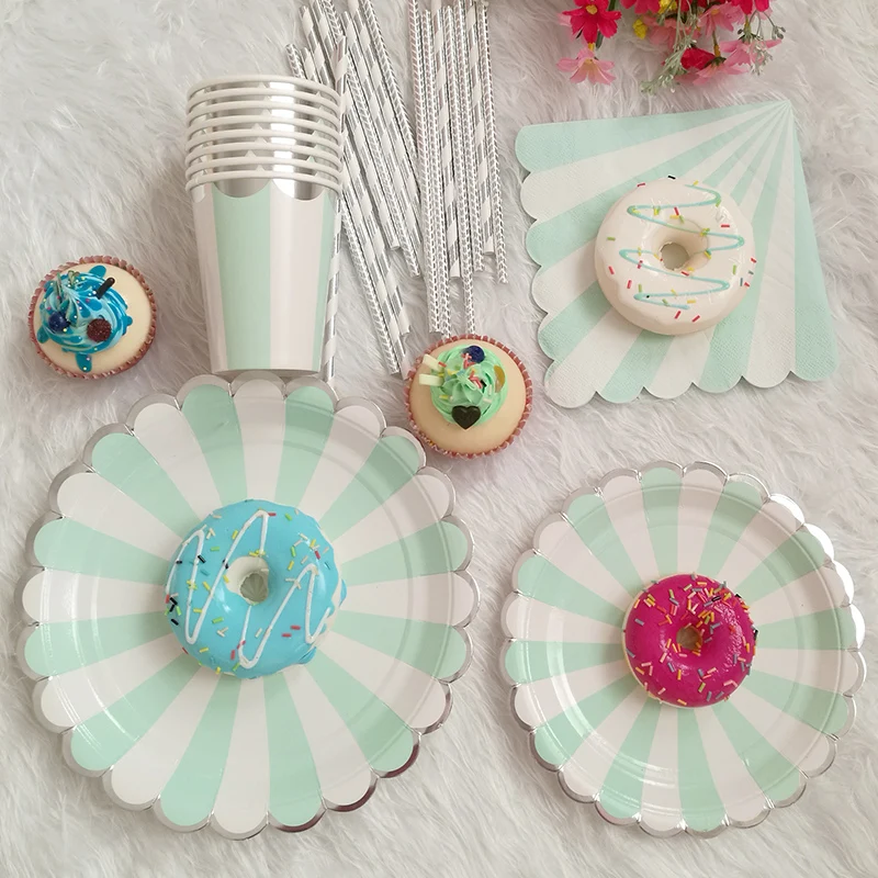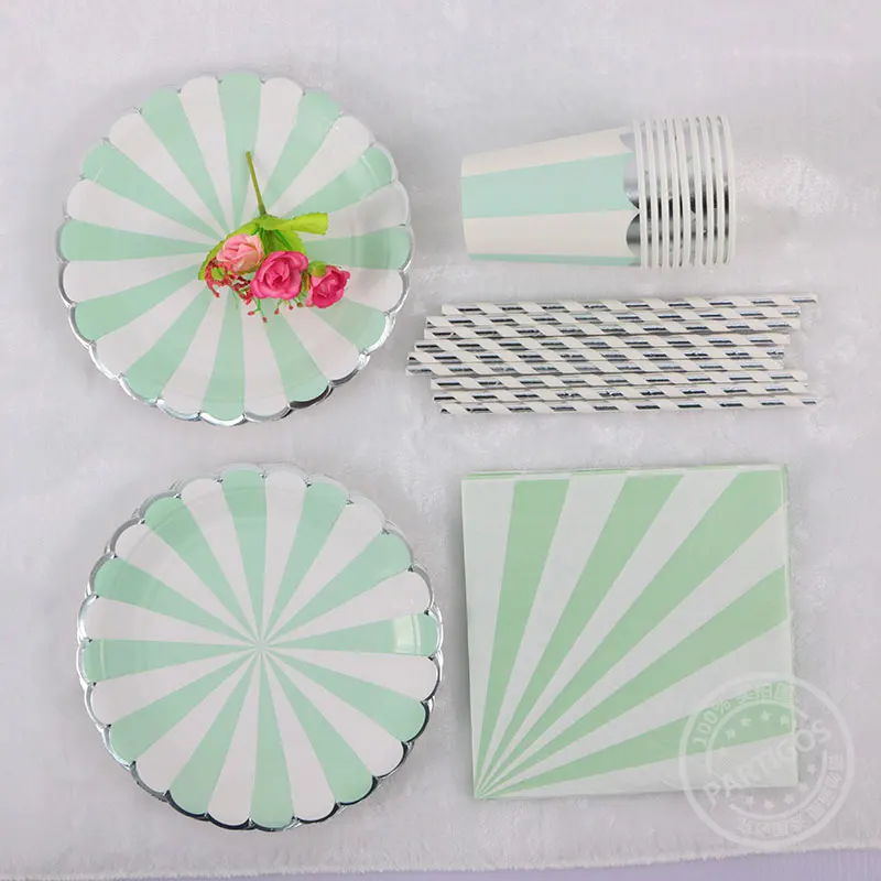 SPECIAL OFFERS 65 pcs 1set pink mint green paper Striped Tableware Wedding Birthday disposable Plates Cups Straws Napkins party decor Supplies Online