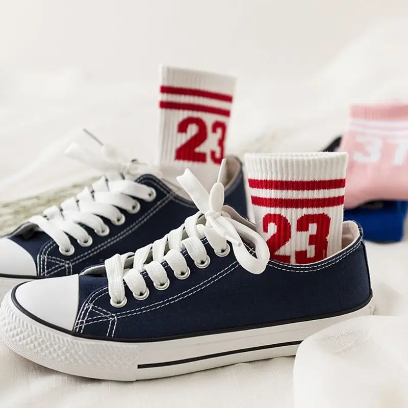 SPECIAL OFFERS Womens Preppy Style Harajuku Cotton Crew Socks Double Striped Numbers Printed Japanese Baseball Sports Mid Tube Hosiery one of the best